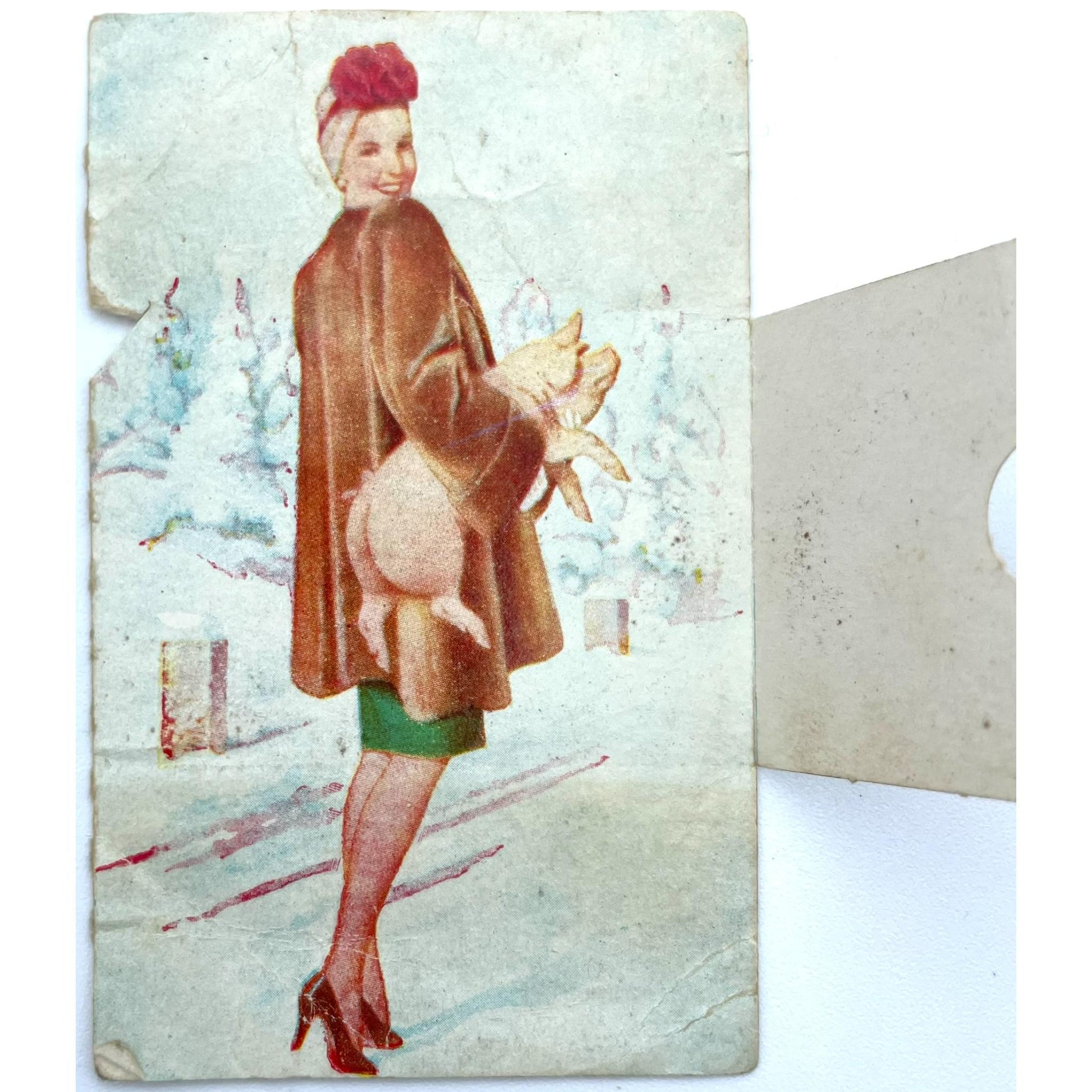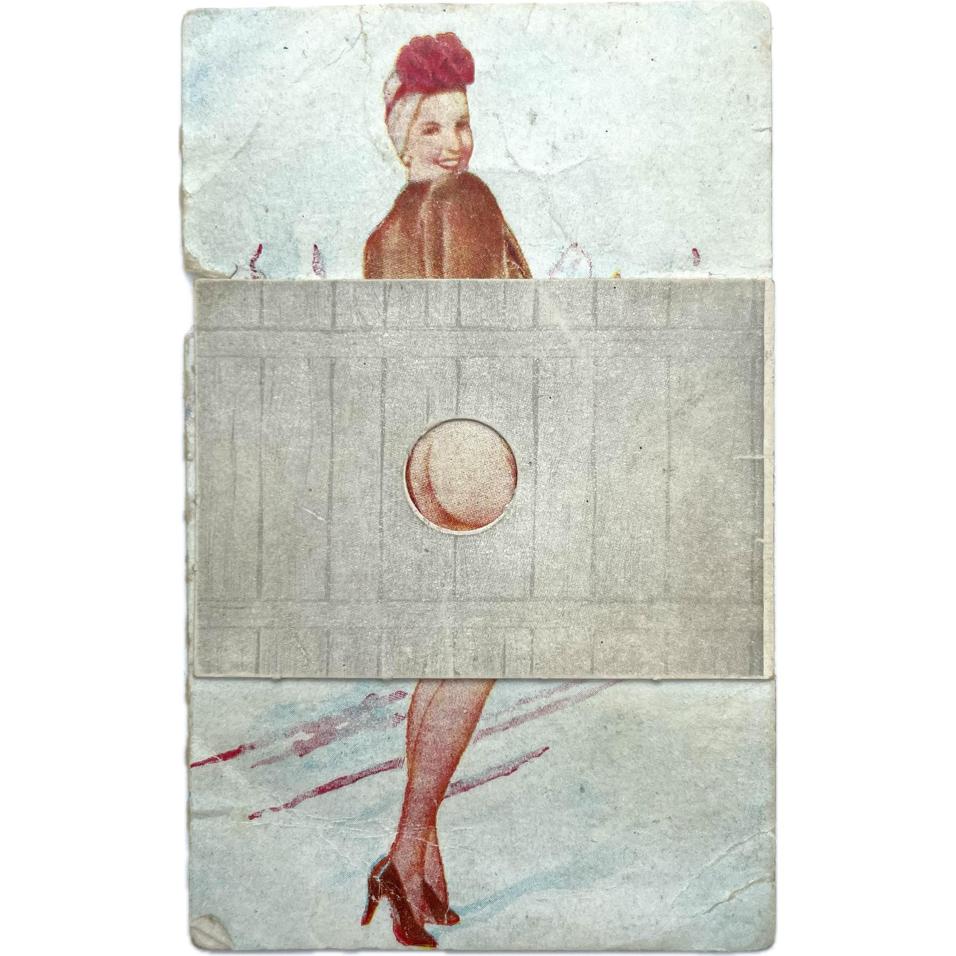 Description: A movable illustrated card containing a cheeky optical illusion. A circular cut-out appears to show a woman's rear, but when you lift the flap, the image transforms to reveal that the rear belongs to a pig that the woman is holding. On the verso is another drawing containing a hidden image. On white card stock, with color and black-and-white illustrations. Undated, probably circa 1950. 4 x 2.5 inches. Moderate creasing, toning, and edgewear with a small chip. Good+.