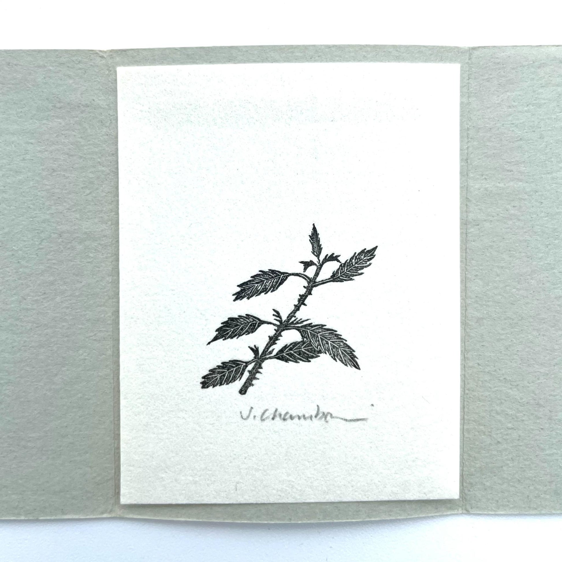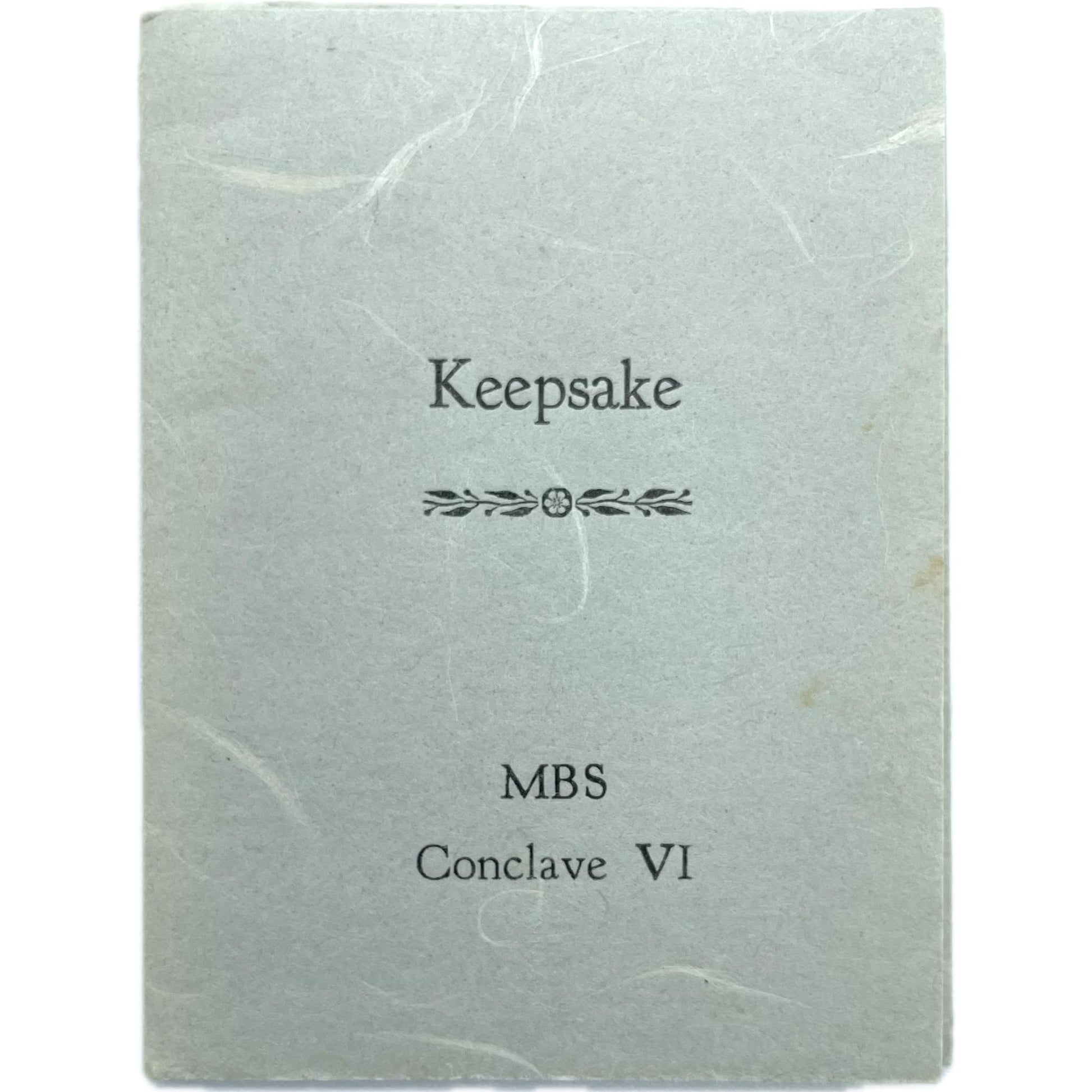 Description: Miniature booklet containing an original wood engraving by Sarah Chamberlain, signed by the artist. Keepsake of the Miniature Book Society (MBS) Conclave VI, which occurred in San Antonio in 1988. In gray foldout wrappers, printed with black lettering. 3 x 2.25 inches, [1] leaf (tipped-in) with engraving. A touch of edgewear, else Fine.