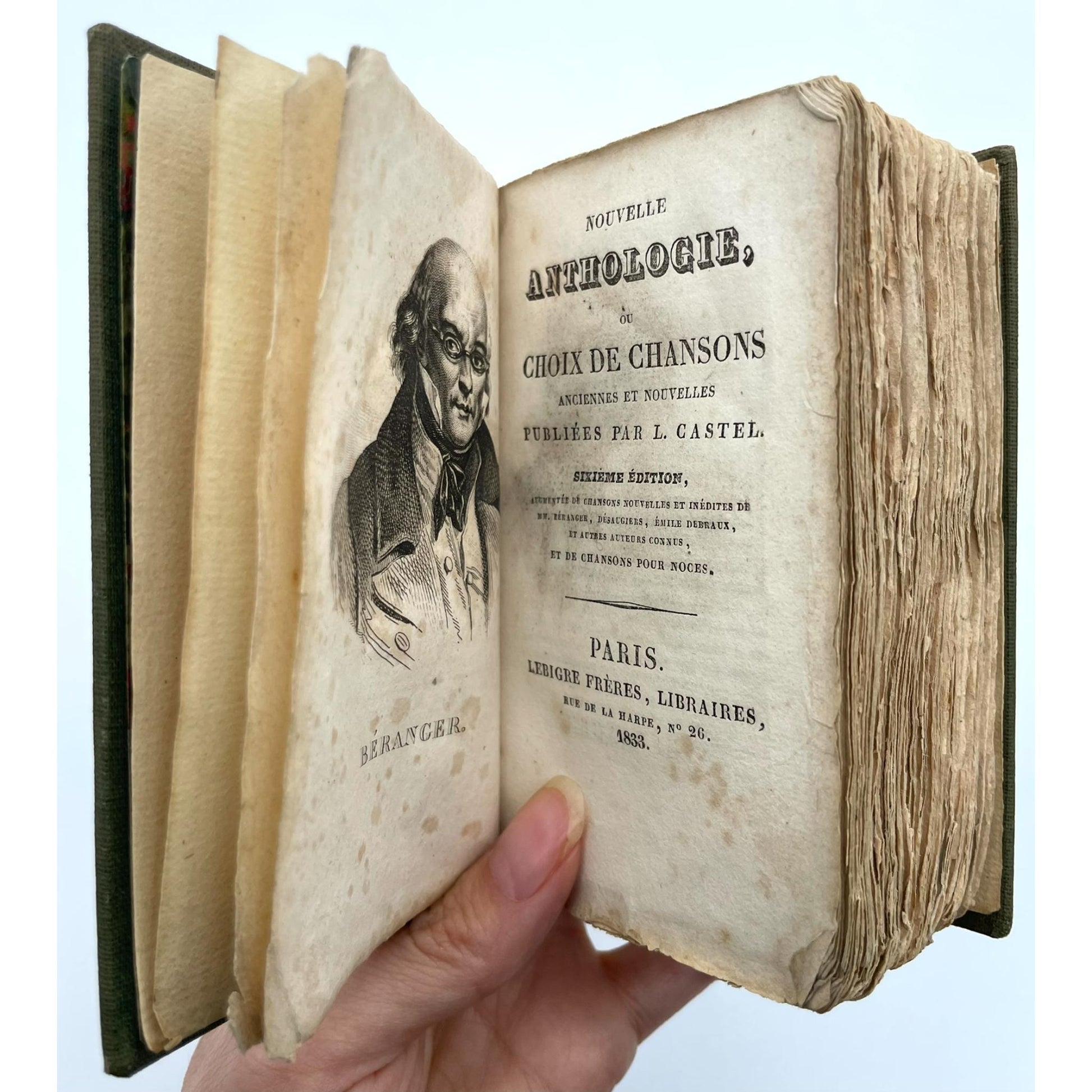 Description: Pocket-sized anthology of French song lyrics. Engraved frontispiece portrait. Rebound by Jacqueline Sanders-van Maarsen, Anne Frank's best friend, in full olive cloth over boards, with original printed paper wrappers pasted on covers, marbled endpapers, and binder's printed paper label on front pastedown. 16mo; 4.5 x 2.75 inches; ix, [2], 12-511, [1] pages, [1] leaf of plates; [1]8 2-308 [31]16. Moderate foxing, damp-staining, and variation in page sizes, but a clean binding. Very Good overall.