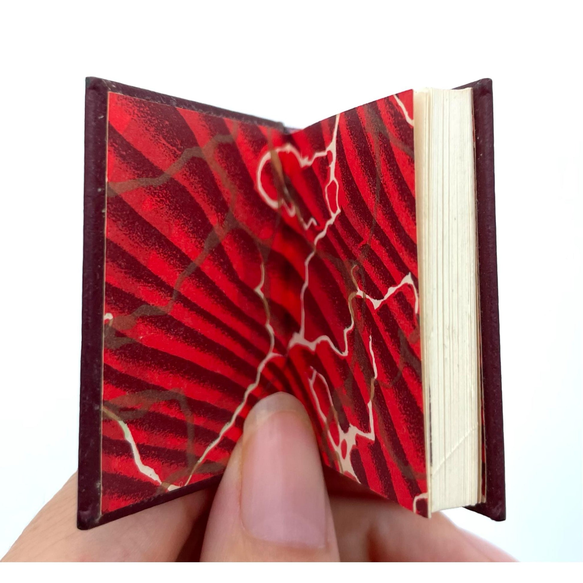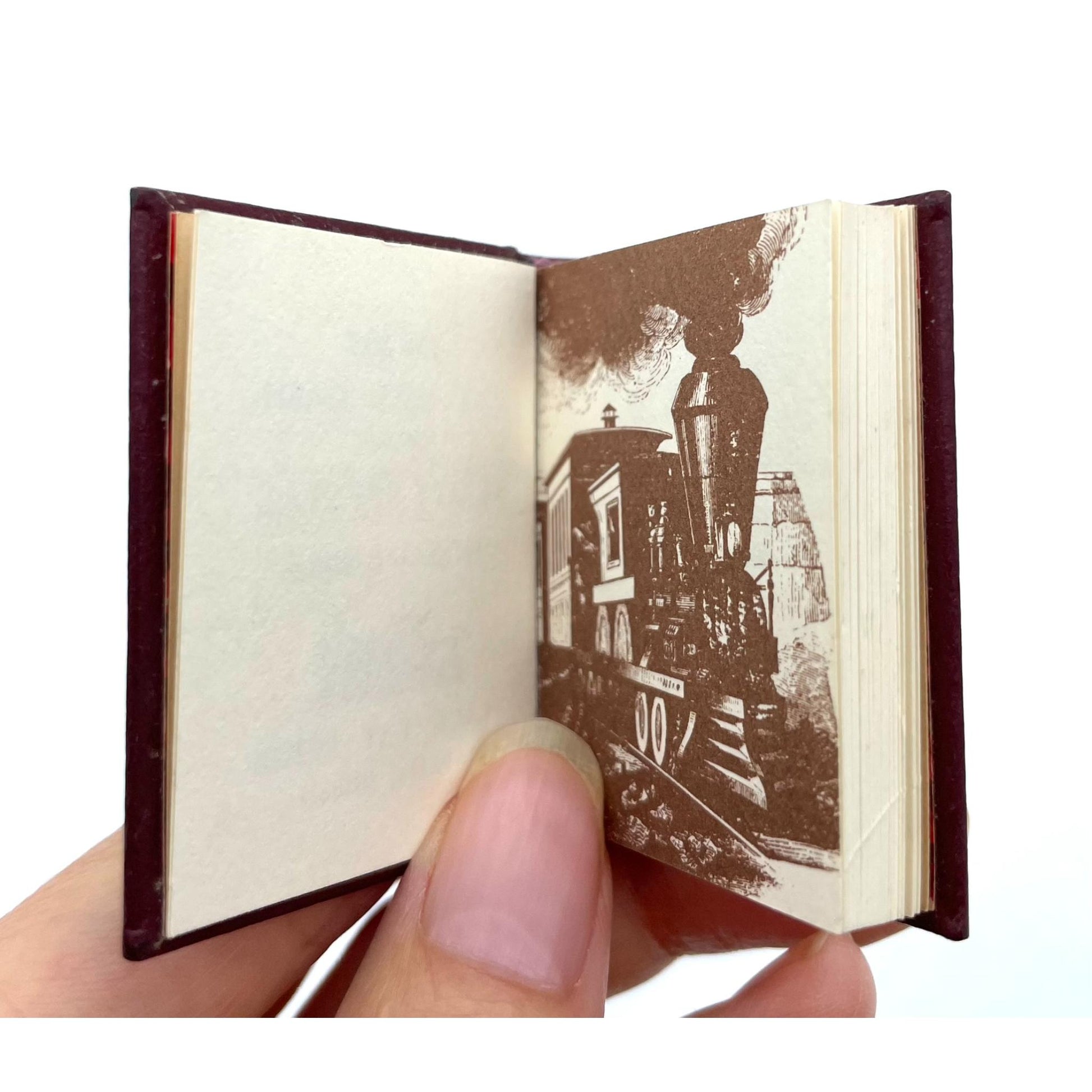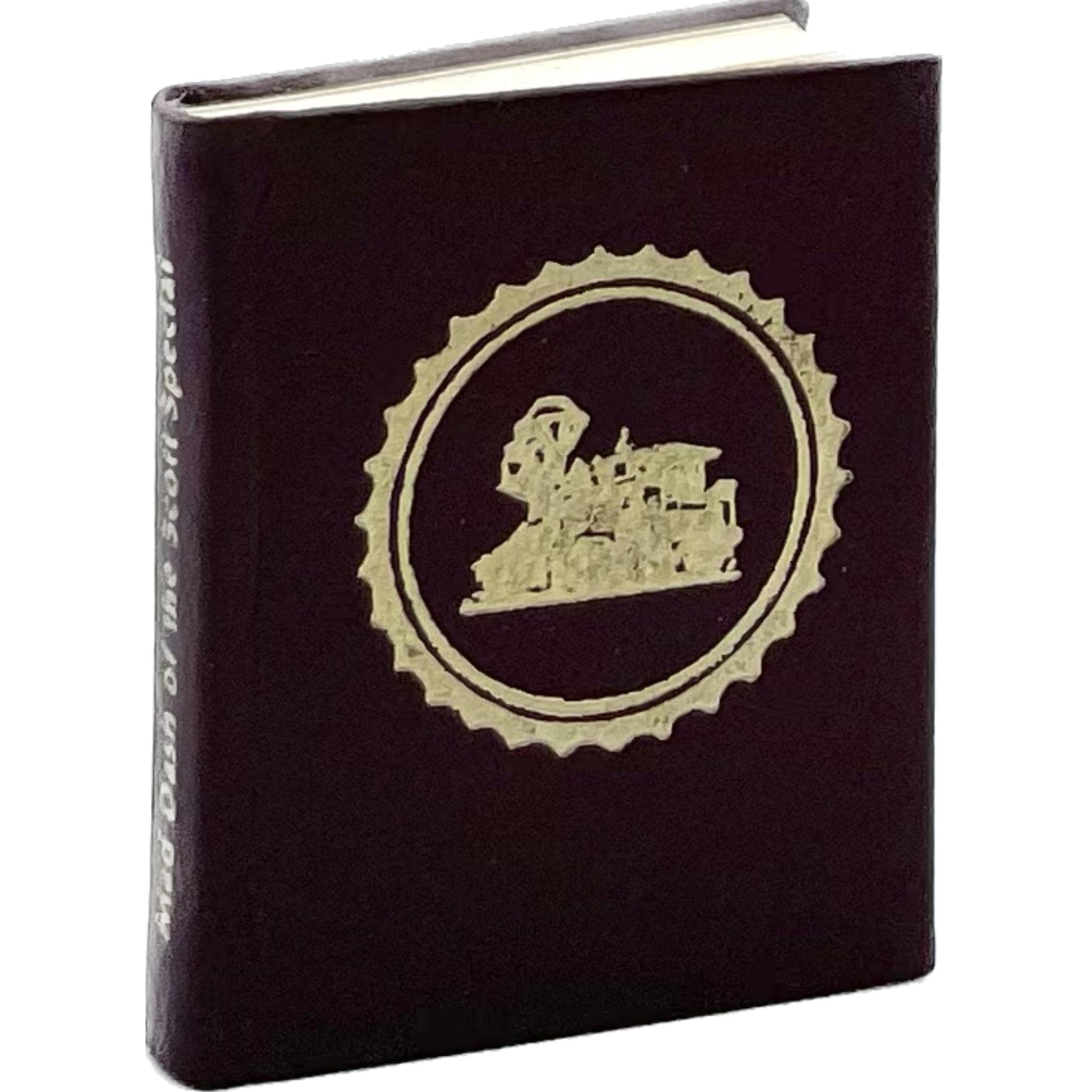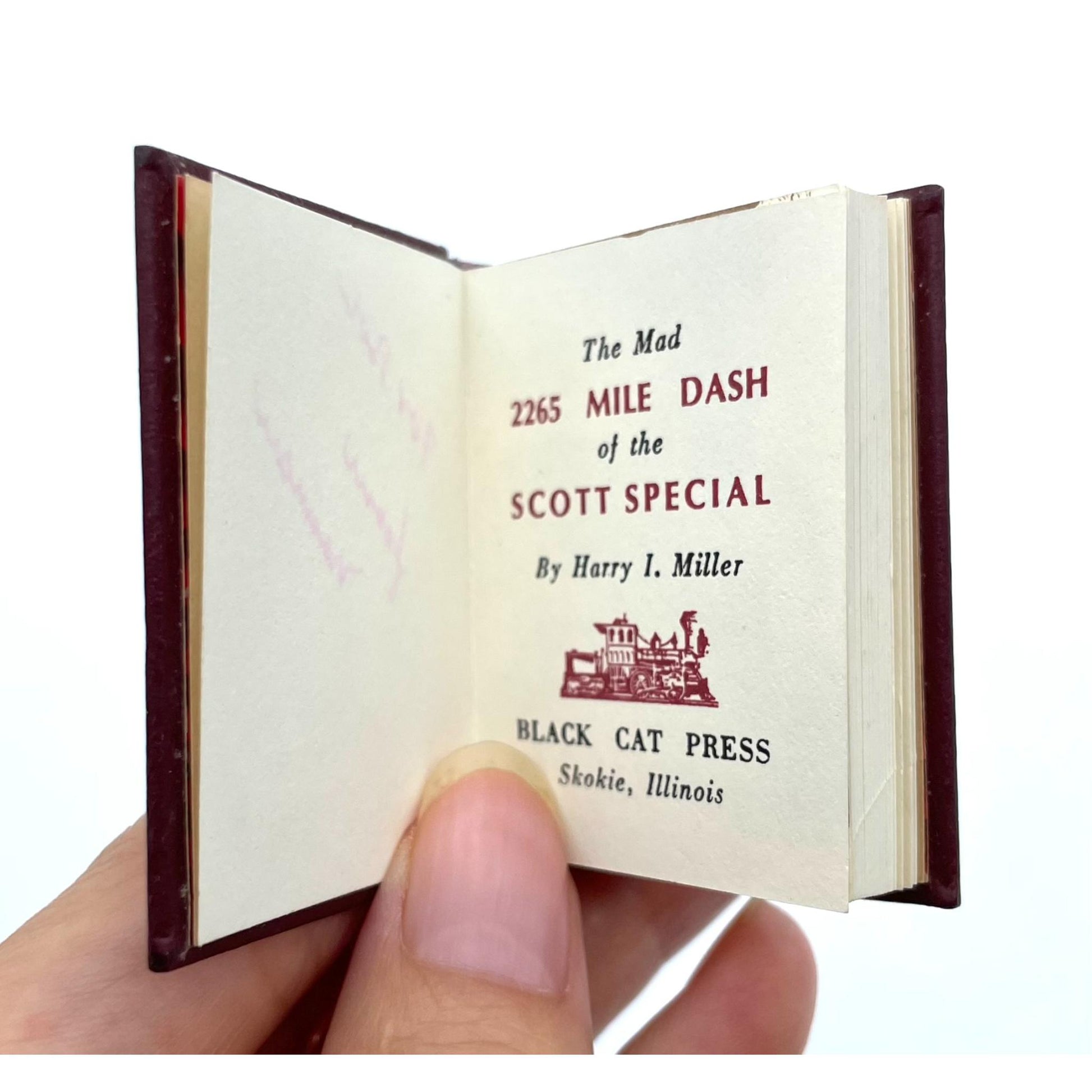 Description: Miniature book containing the story of the Scott Special, a train that broke speed records while running from Los Angeles to Chicago in 1905. Inscribed by the book's designer Norman W. Forgue of the Black Cat Press. One of 249 copies. Title page in brown and black. With title page vignette, full-page illustration of a steam train, and a map. Bound by Bela Blau in full brown leatherette over boards, with gilt lettering on the spine, a gilt train design on the front cover, and marbled endpapers. 1.75 x 1.5 inches; 72 unnumbered pages (first leaf blank). Mild wear to the covers and one bifolium loose, but present; internally clean. Very Good+.