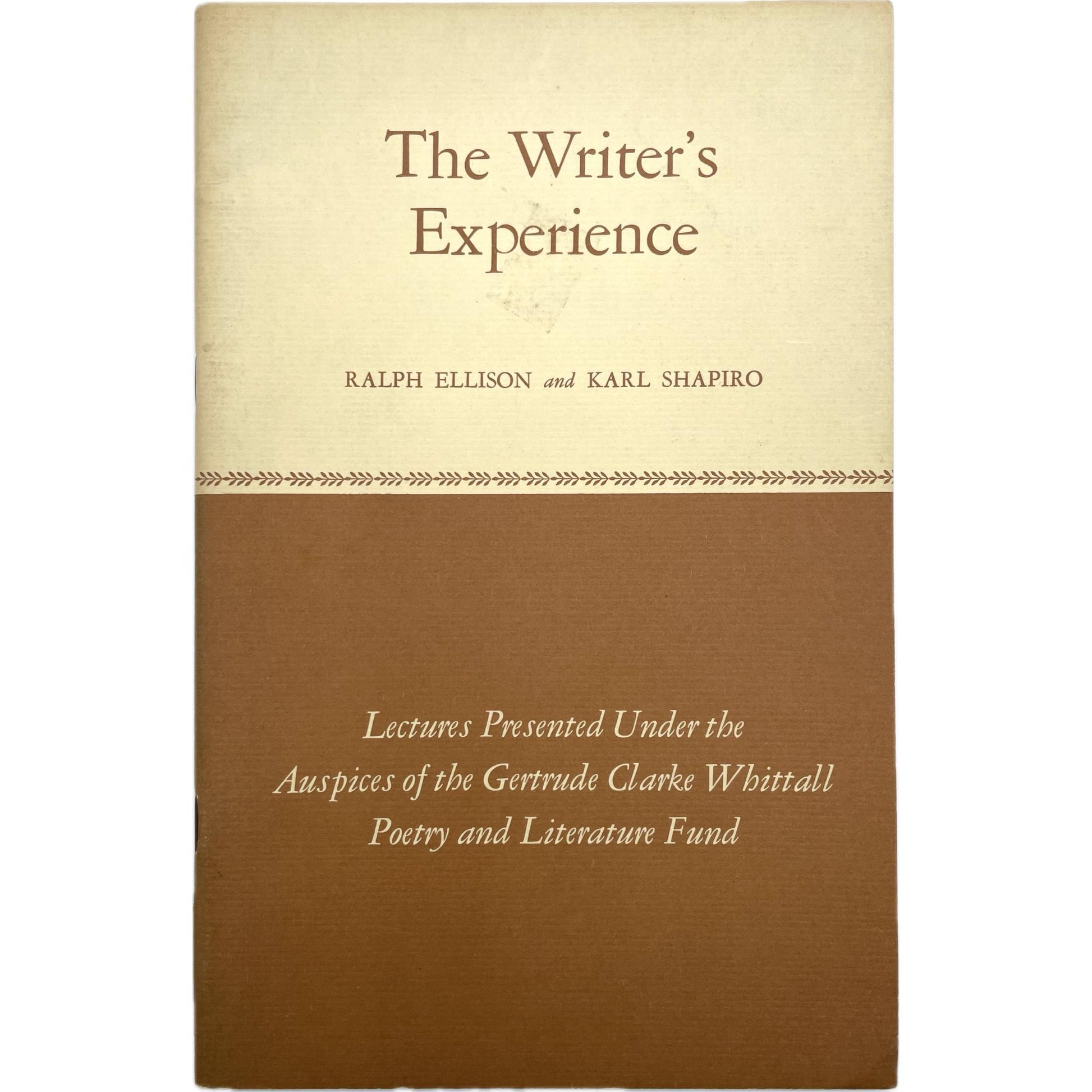 Description: Lectures given by Ralph Ellison and Karl Shapiro at the Library of Congress on January 6 and 27, 1964. First edition. Stapled in tan and brown printed wrappers. 9.25 x 6 inches; v, [1], 32, [2] pages. Light wear and dust-soiling to wrapper, but a clean interior. Very Good+. Cover title: The Writer's Experience: Lectures Presented Under the Auspices of the Gertrude Clarke Whittall Poetry and Literature Fund. Contents: Hidden name and complex fate: a writer's experience in the U.S. / R. Ellison. -- American poet? / K. Shapiro.