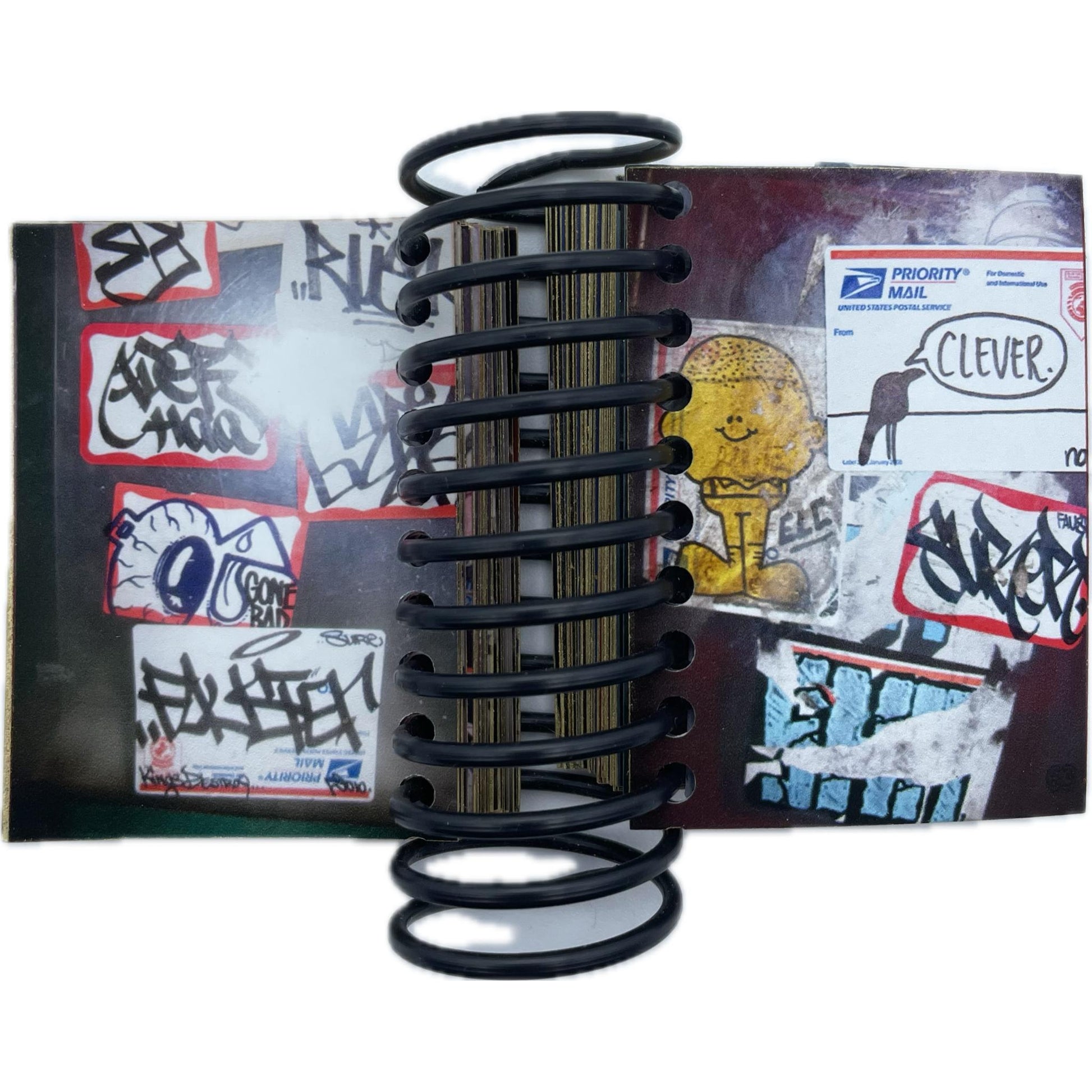 Description: Miniature artist's book consisting entirely of photos of the fronts of free newspaper boxes and the tags, graffiti art, and stickers found on them. Color inkjet-printed. Spiral-bound with glow-in-the-dark front cover. 2.5 x 2.75 inches; [128] pages, [1] folded leaf of plates. Accompanied by 5.5 x 4.25 sheet with image of newspaper box on the recto and signature of the artist on the verso. Fine.