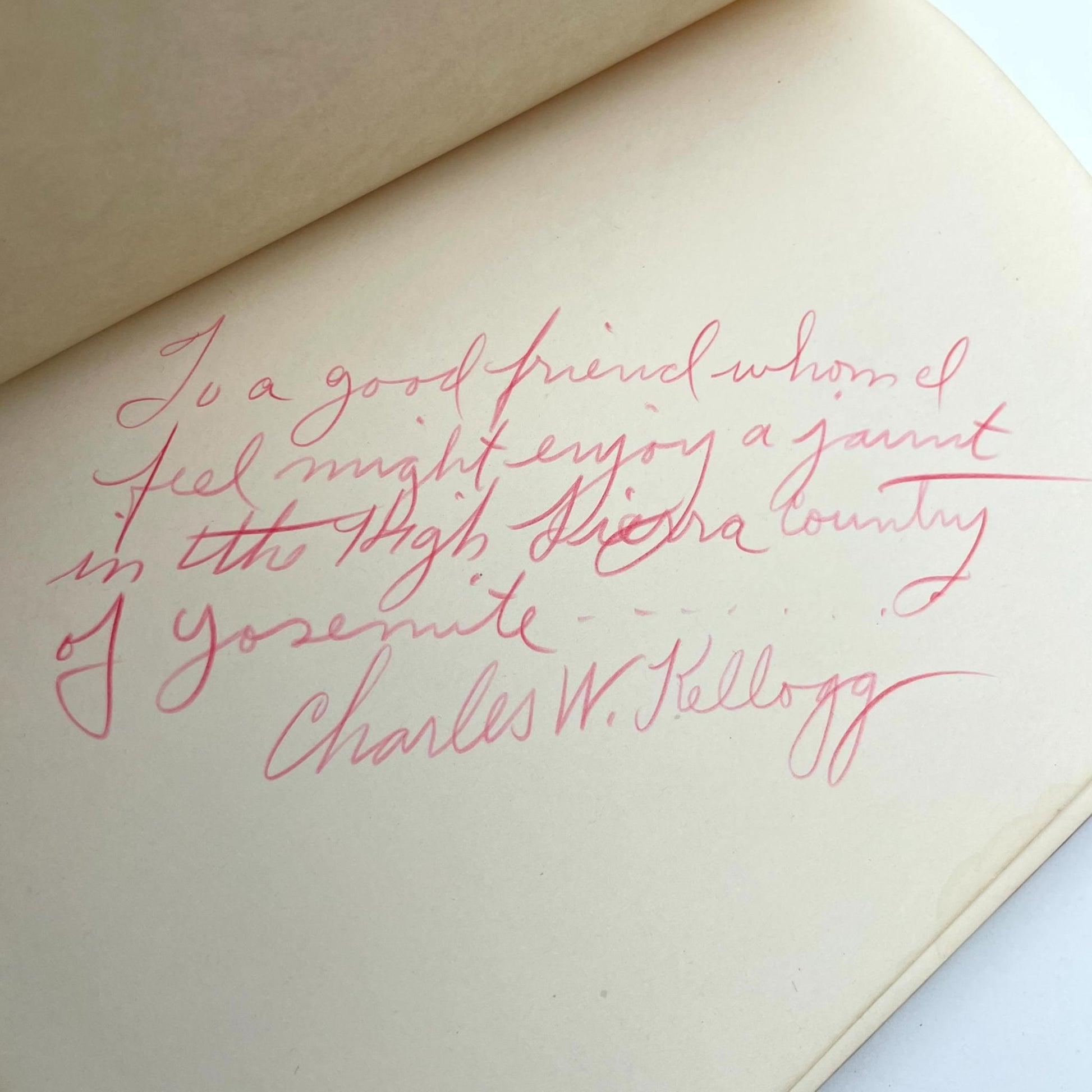 Description: An account of the author's six-day journey on muleback in 1938 through the High Sierras (Sierra Nevada) of Yosemite National Park, printed by students of the David Hale Fanning Trade School for Girls. Signed and inscribed by the author on the front fly-leaf: "To a good friend whom I feel might enjoy a jaunt in the High Sierra country of Yosemite. Charles W. Kellogg." First edition. Black-and-white illustrations throughout. Title page in green and black. Bound in full red-brown paper over boards, with pictorial design printed in black on front cover and map-illustrated endpapers. 7.75 x 5.5 inches; 157, [3] pages (first and last leaves blank as issued). Binding moderately sunned with residue of a label at the tail of the spine, but a crisp and clean interior. Very Good.