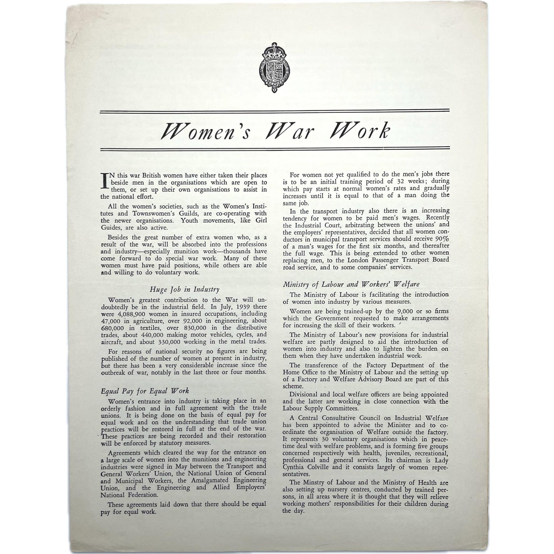 Description: Details the work of British women during World War Two in a variety of industries and services, such as the Women's Land Army, Auxiliary Territorial Service, Women's Royal Naval Service, Women's Auxiliary Air Force, civil defense units, Women's Voluntary Services, and Civil Nursing Reserve. Undated, but 1941, according to Worldcat and an annotation in pencil on p. [4]. Bifolium, folded to 8.5 x 11 inches; [4] pages. Creasing at corners, but a clean copy. Very Good. Uncommon, with Worldcat showing seven institutional holdings.